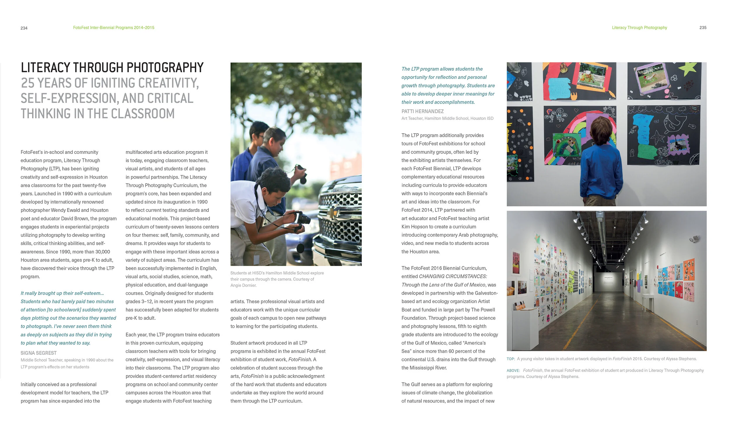 Co-author of "Literacy Through Photography: 25 Years of Igniting Creativity and Self-Expression in the Classroom,” an essay in the FotoFest 2016 Biennial Catalog about FotoFest’s classroom learning program. I co-coordinated the program from 2015-2016.
